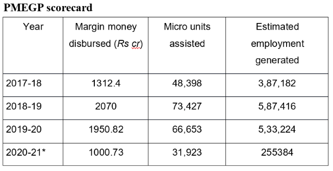 Recently, the government introduced an online process, including a score card in co-ordination with the banks, for assessment of the proposal by the applicant, discontinuation of the role of District Level Task Force (DLTFC) which has led to 64% increase in sanctions under PMEGP in 2020-21, diversification of products by PMEGP units, and the designing of a geo-tagging portal namely www.geotag.kvic.gov. The performance of the scheme during last three years and the current financial year is given in the table below.