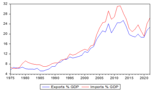 Over the years, India’s integration into the global economy has deepened, as reflected in the increasing share of imports and exports in its GDP. Despite economic fluctuations, the consistent rise in both exports and imports underscores India’s growing global trade involvement. However, the export-to-GDP ratio has often been lower than the import-to-GDP ratio, leading to persistent trade deficits, particularly after 2005.