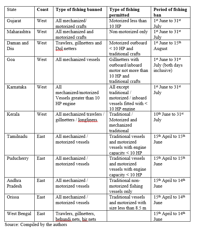 In India, the SFB was first started in 1988 in Kerala, targeting trawl fishing. There have been wide variations in terms of implementation of the ban, both regarding the time and the duration of the fishing ban and also with regard to the classification of fishing vessels. The controversy continues till date. A comparative account of the fishing ban adopted in different states (as on 2019) is provided in Table below: